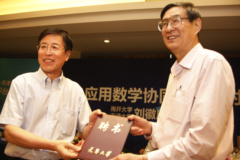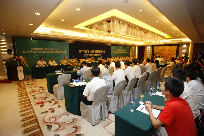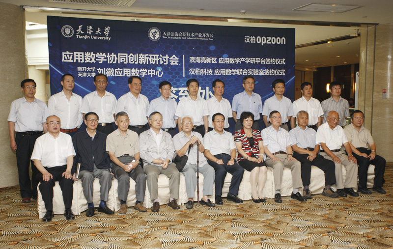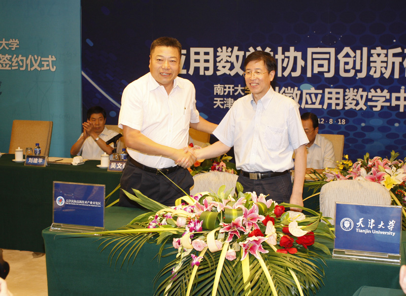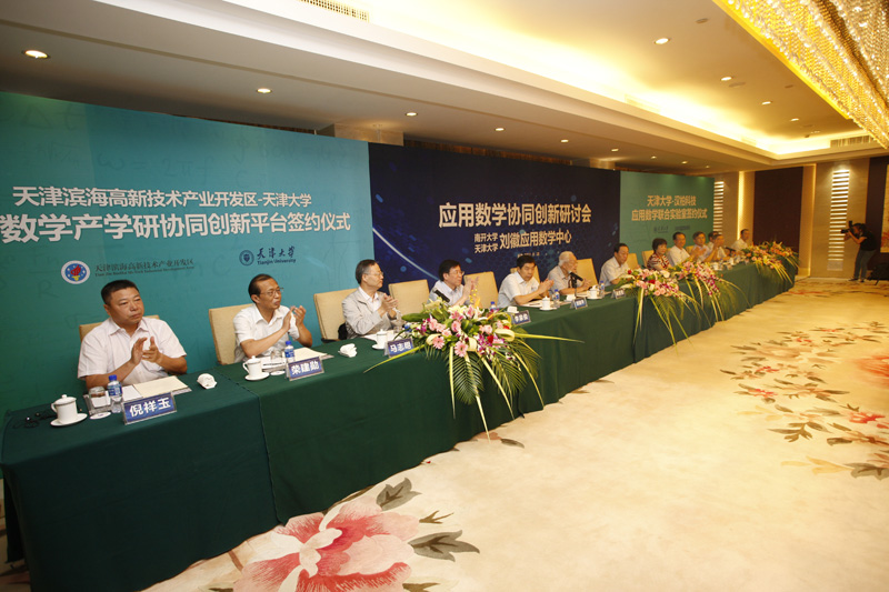 本站讯(记者 宋雪峰 刘思思 摄影 王建泽)8月18日,天津大学应用数学中心名誉主任及主任授聘仪式暨天津大学与滨海高新技术产业开发区管委会区共建应用数学产学研协同创新平台、天津大学与汉柏科技应用数学联合实验室签约仪式在天津赛象酒店举行。全国人大副委员长、九三学社中央主席、中国科协主席韩启德为天津大学应用数学中心成立发来贺信。天津市政协主席邢元敏,中共天津市委常委、市教育工委书记朱丽萍出席签约仪式。中国科学院院士、南开大学教授葛墨林和陈永川分别受聘为天津大学应用数学中心名誉主任和主任。仪式前,南开大学天津大学刘徽应用数学中心和天津大学应用数学中心联合举办了“应用数学协同创新研讨会”。天津大学党委书记刘建平、校长李家俊,南开大学党委书记薛进文、校长龚克,中国科学院院士吴文俊、马志明、李大潜、郝柏林、周恒、张春霆、鄂维南、张伟平,天津市滨海高新技术产业开发区工委书记荣建勋、管委会主任倪祥玉,汉柏科技有限公司董事长彭海帆,天津市政协、和平区政协、滨海高新技术产业开发区管委会相关领导、合作企业领导及同行专家近百人参加了签约仪式。天津大学副校长、中国工程院院士钟登华主持仪式。