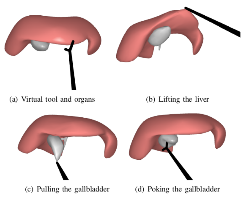 课题组提出了可保持体积、保持非线性的质子弹簧系统, 可以用于模拟肝脏等不可压缩的软组织的形变。如下图所示, 我们提出的方法已被用于肝脏胆囊的形变仿真过程, 相关工作发表于IEEE Journal of Biomedical and Health Informatics, 并申请了专利。