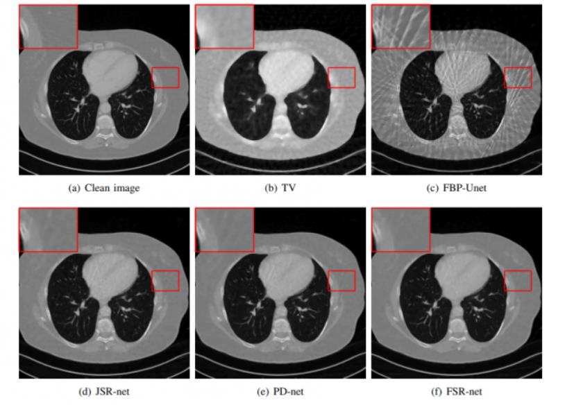 针对CT图像不完备成像问题, 课题组提出了有效的重建模型和算法, 并运用卷积神经网络建立端到端的可学习化模型。如图所示, 我们提出的方法可以有效的减少图像中的伪影现象, 相关工作发表于IEEE Transactions on Computational Imaging。