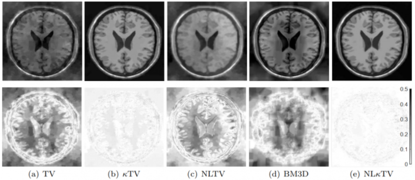 课题组提出了非局部的曲率正则化方法, 并应用于CS-MRI重建问题。如图所示, 在10%采样率的情况下, 我们的结果明显好于SOTA, 相关结果发表于Journal of Mathematical Imaging and Vision。